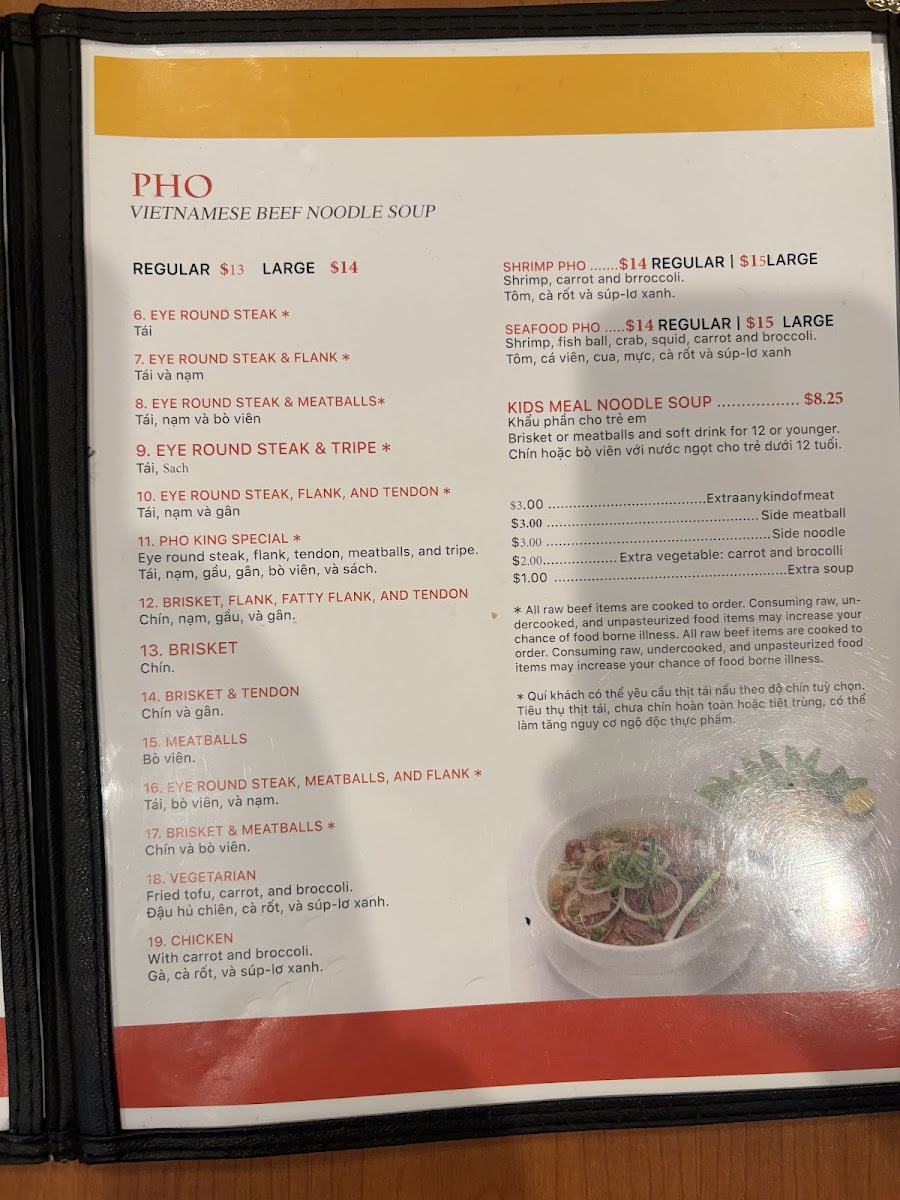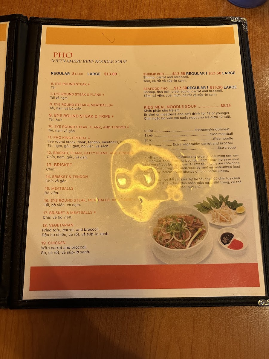Pho King offers a diverse and exciting menu that caters to various tastes, with dishes ranging from comforting pho to bold house specials. The Pho King Special (11) stands out as a signature offering, blending rich flavors in a hearty bowl of pho. For those who prefer a more traditional approach, the Eye Round Steak, Meatballs & Flank (16) or Eye Round Steak & Meatballs (8) are both flavorful choices that are sure to satisfy. The Kids Meal Noodle Soup offers a lighter option for younger diners, ensuring the whole family can enjoy the experience.