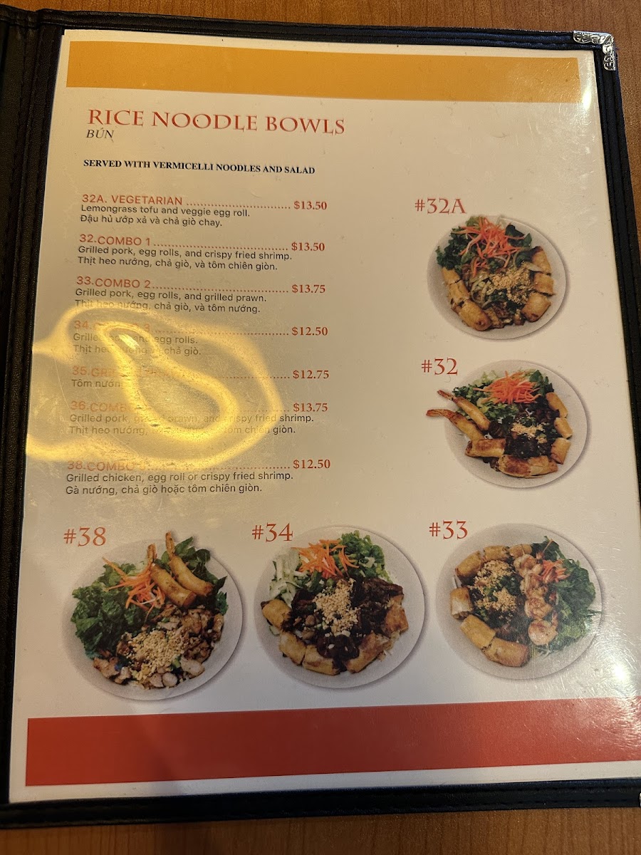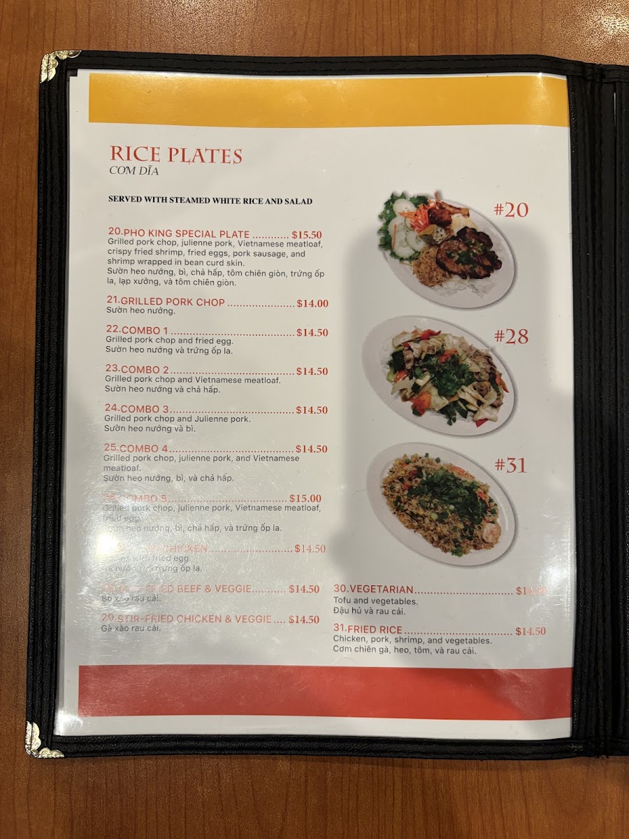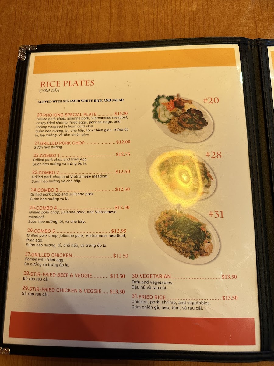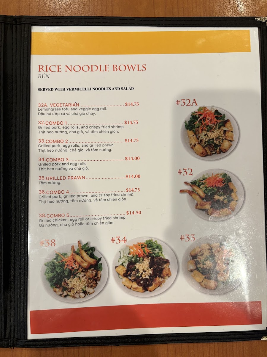 In addition to pho, the menu features an array of Rice Plates, including options like the Grilled Chicken (27), Combo (24), and Vegetarian (30), each offering unique tastes and textures. Similarly, the Rice Noodle Plates section is varied, with Combo options (such as 38, 34, 33, and 36) providing a combination of proteins, while the Vegetarian (32A) offers a delicious plant-based option.