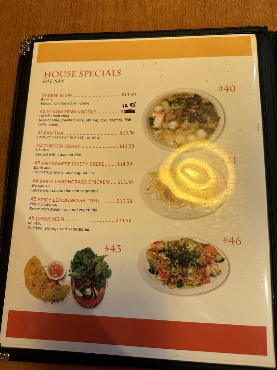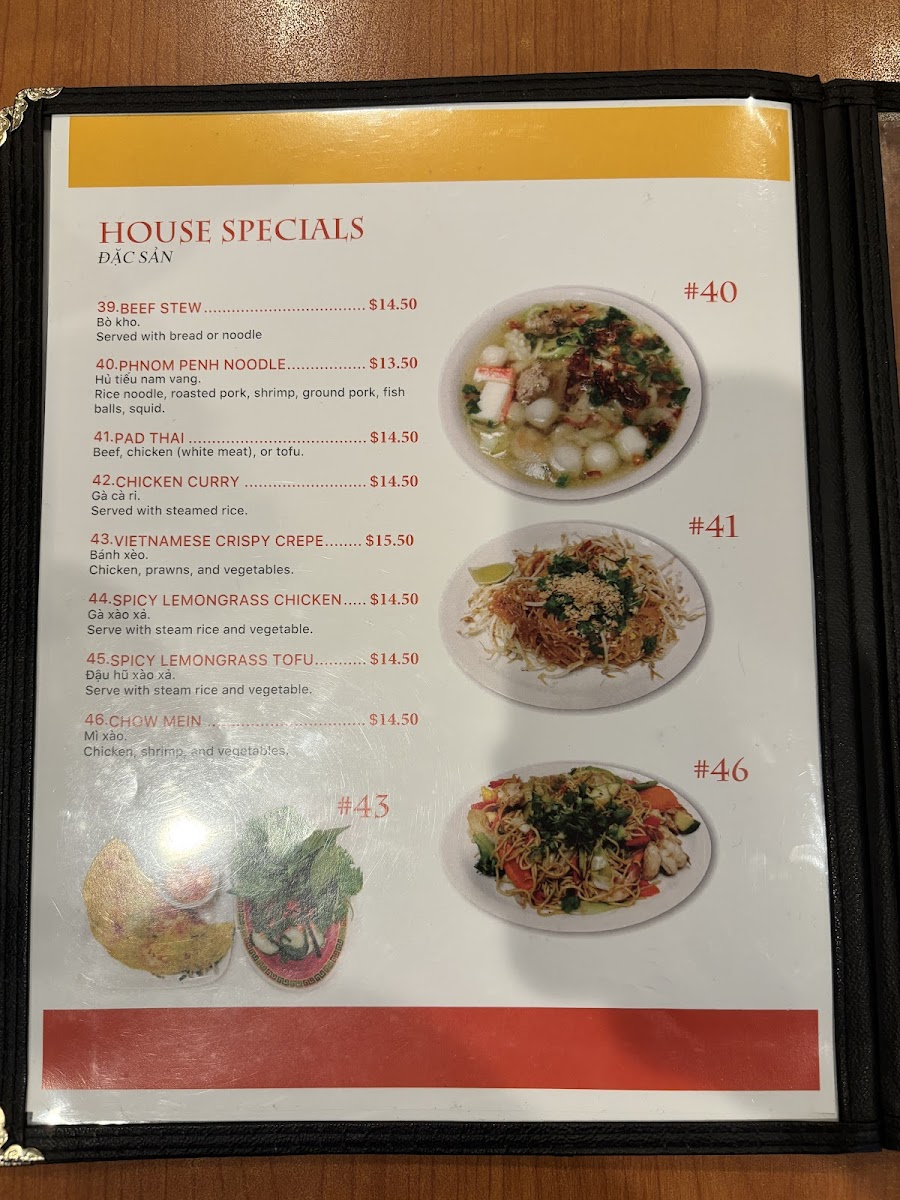 House specials at Pho King are not to be overlooked, with standout dishes like Vietnamese Crispy Crepe (43) and Beef Stew (39) offering a savory experience. If you're in the mood for something spicy, the Spicy Lemongrass Tofu (45) and Pad Thai (41) will bring a burst of flavor. The Chicken Curry (42) offers a hearty, warming dish that’s perfect for those seeking a bit of comfort food.